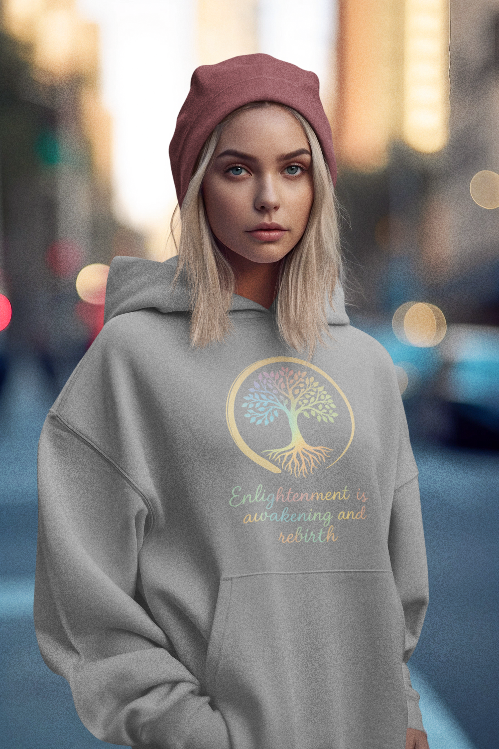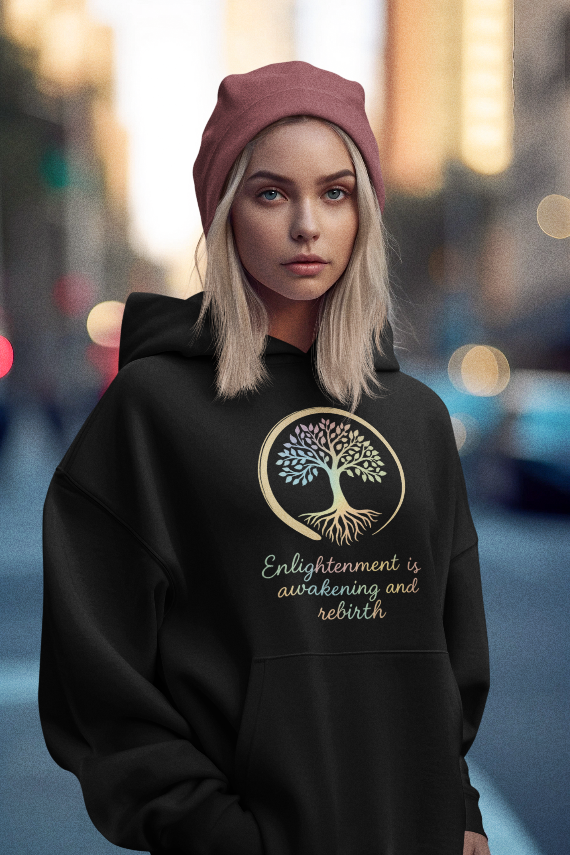 Der Bodhi-Baum in gold-pastelligem Glow steht für Erleuchtung, Erdung und den Mut, neugierig zu wachsen. Der umschließende Kreis symbolisiert Schutz und Harmonie, während der Satz „Enlightenment is awakening and rebirth“ dich täglich daran erinnert, deinen eigenen Weg bewusst zu gehen.