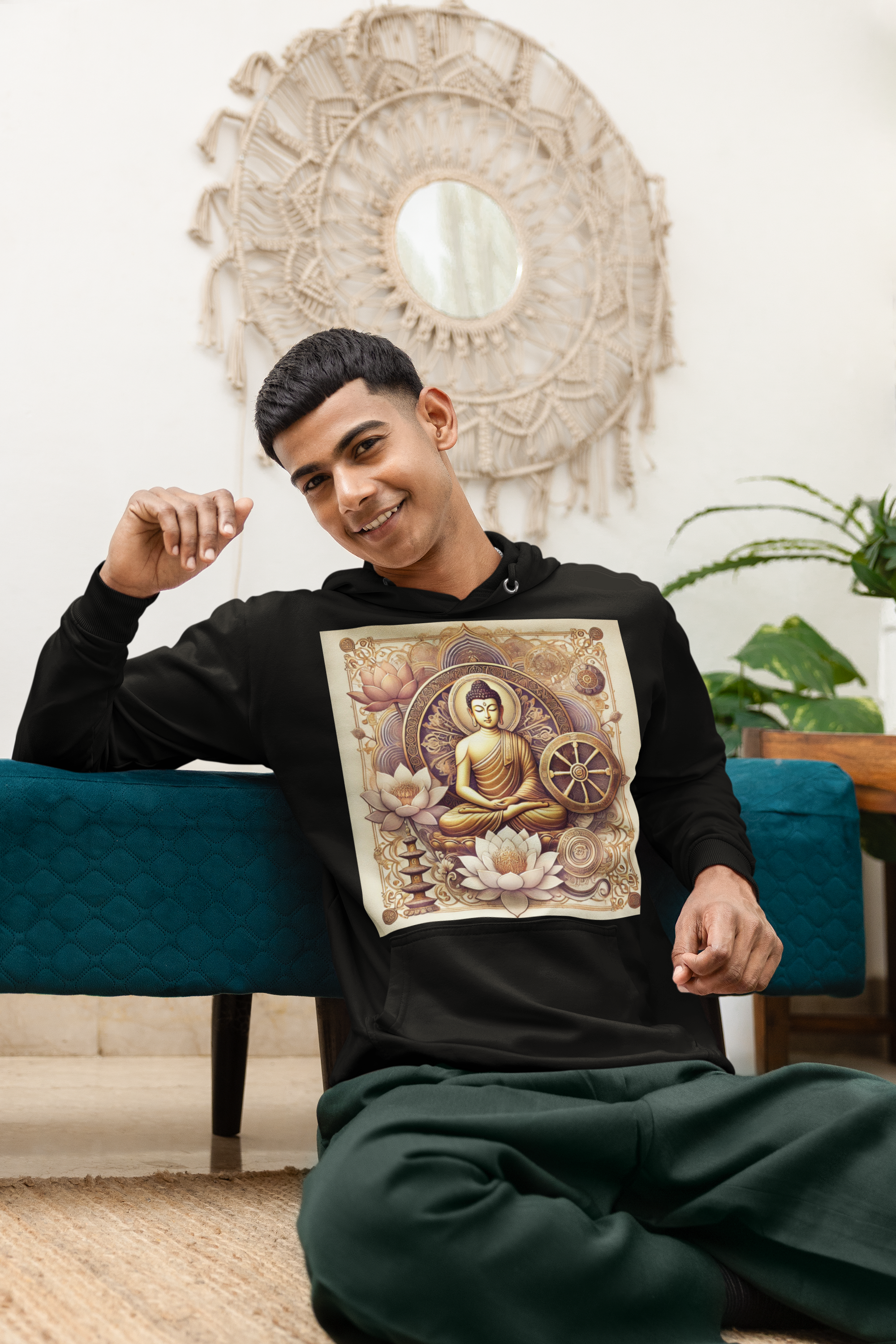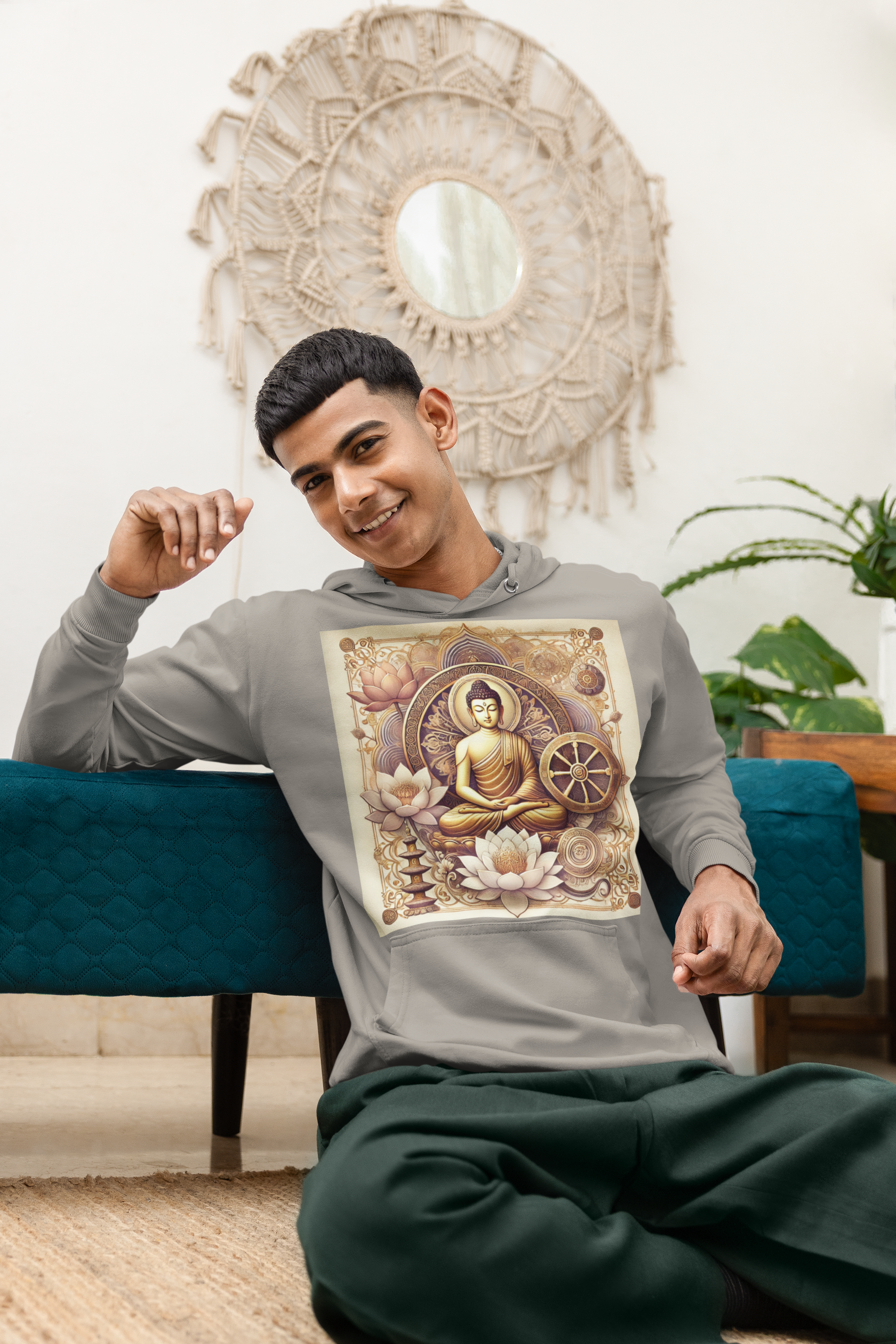 Mit diesem besonderen "Buddha"-Hoodie trägst du nicht nur Wärme, sondern auch Weisheit. Der golden illustrierte Buddha sitzt umgeben von Lotusblüten und spirituellen Symbolen – ein kraftvolles Motiv, das Klarheit, Reinheit und Gelassenheit ausstrahlt.