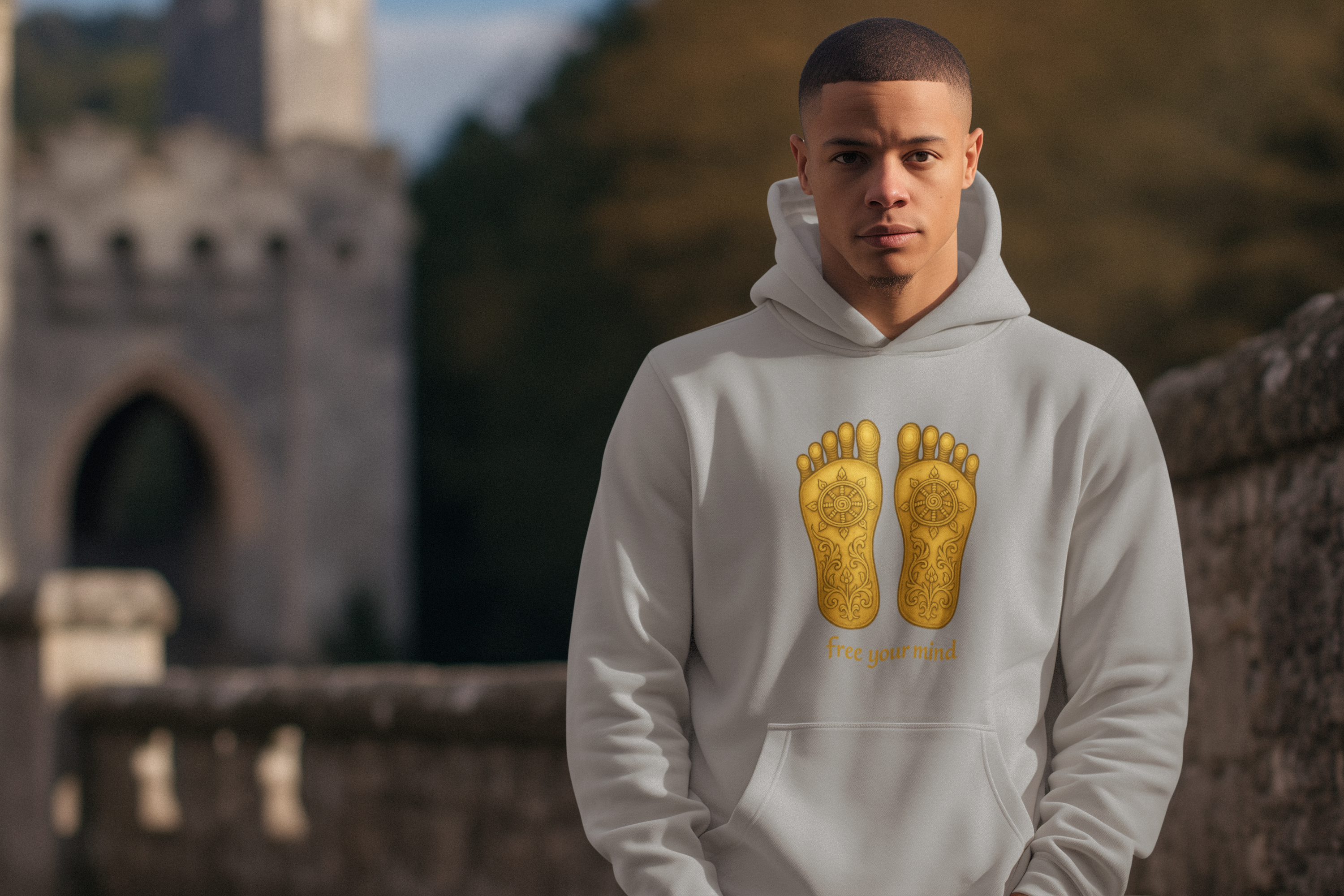 Der „Buddhas Fussabdruck“-Hoodie verbindet warme Geborgenheit mit spiritueller Symbolkraft. Die beiden goldenen Fußabdrücke stehen für Buddhas Weg in die Freiheit – ein Symbol der Achtsamkeit, der Heilung und des inneren Erwachens. Der edle Druck wirkt modern, klar und gleichzeitig tief spirituell.
