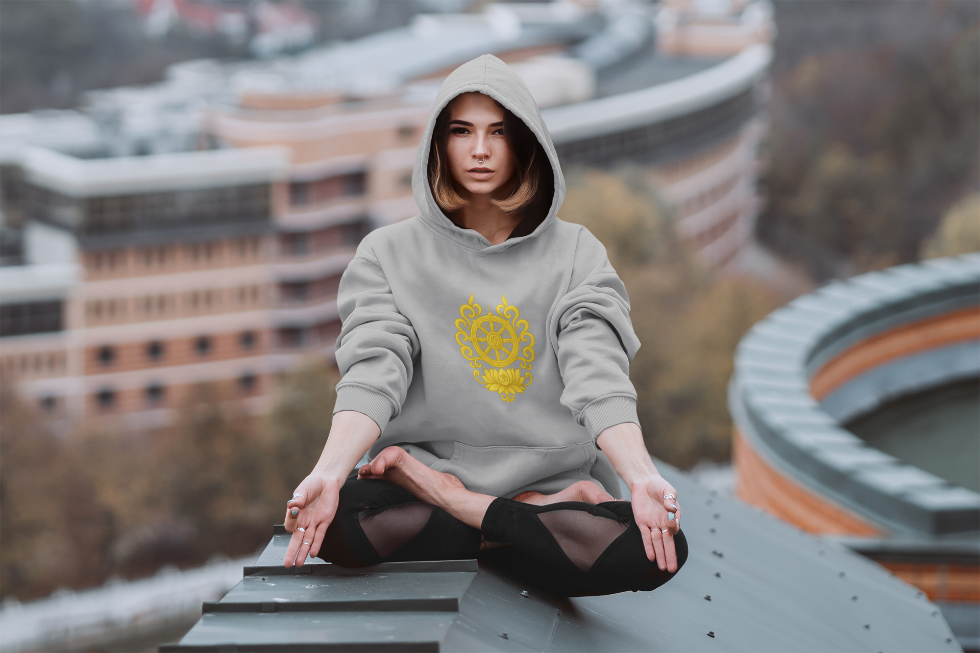 Der Hoodie „Dharma-Rad“ verbindet Wärme, Komfort und spirituelle Tiefe.