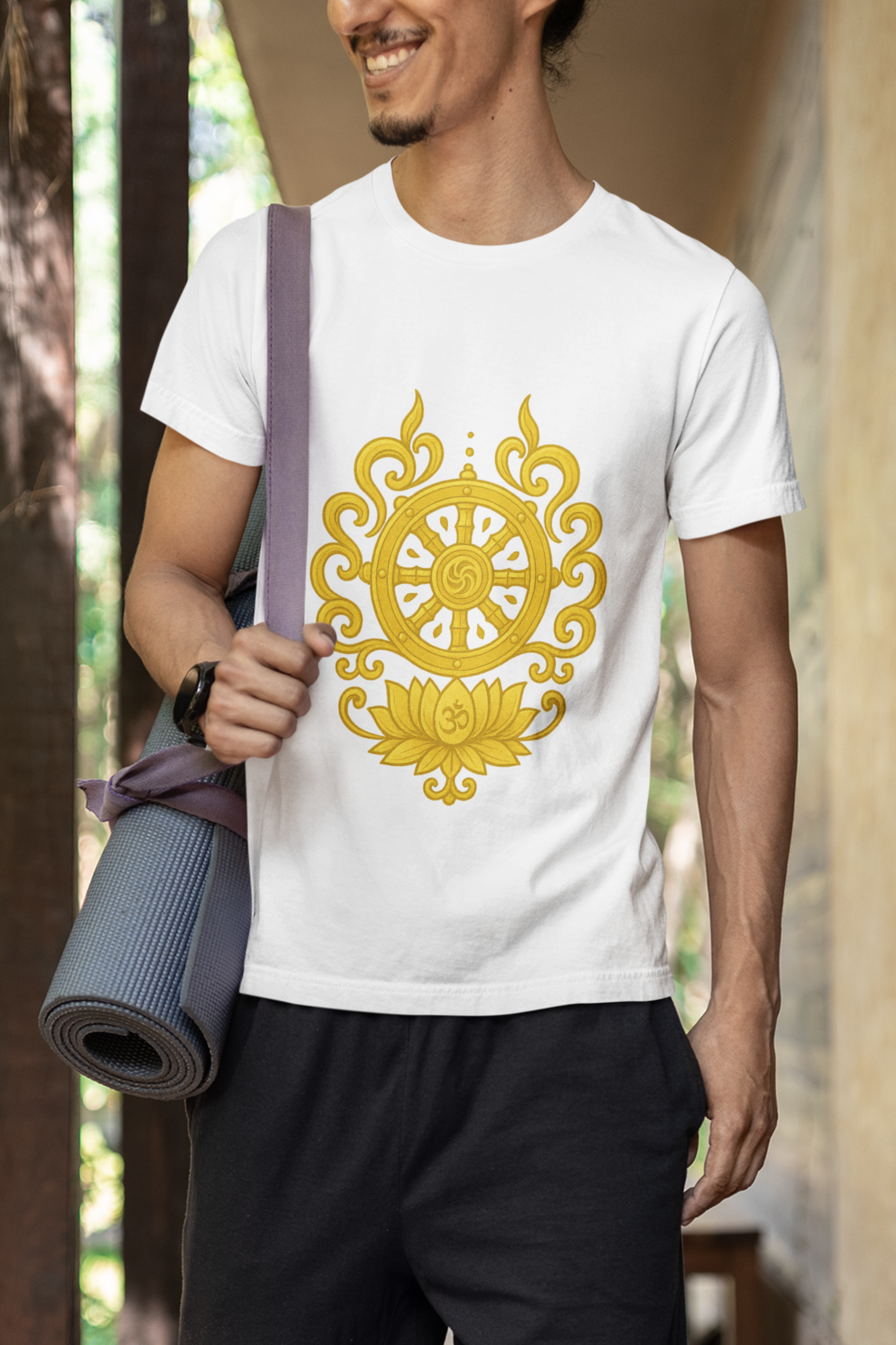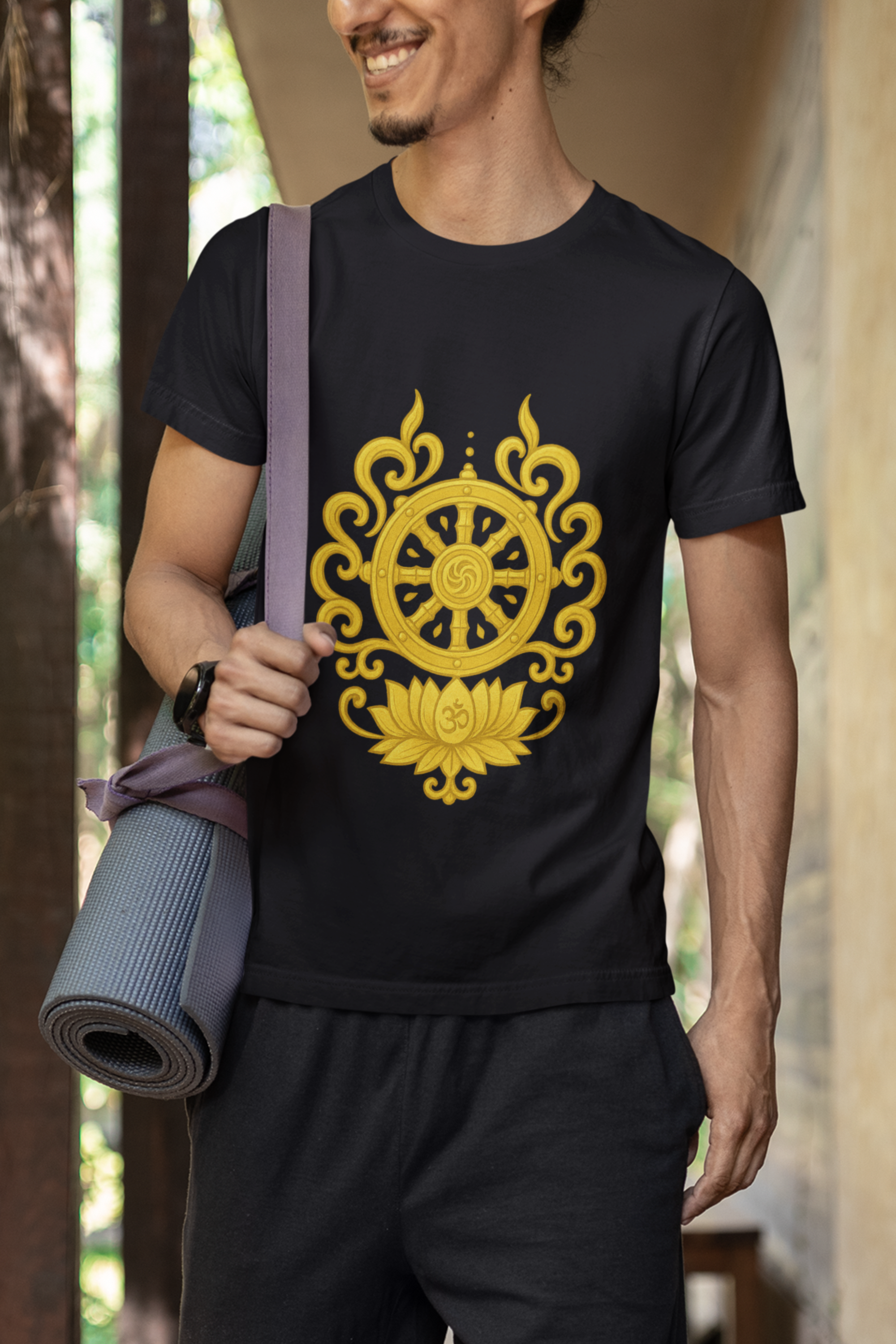 Das Design „Dharma-Rad“ zeigt das heilige Rad des Lebens, umgeben von fließenden Energieformen und getragen von einer goldenen Lotusblüte. Ein starkes spirituelles Symbol, das Kraft, Wahrheit und den Weg zur Erleuchtung repräsentiert.