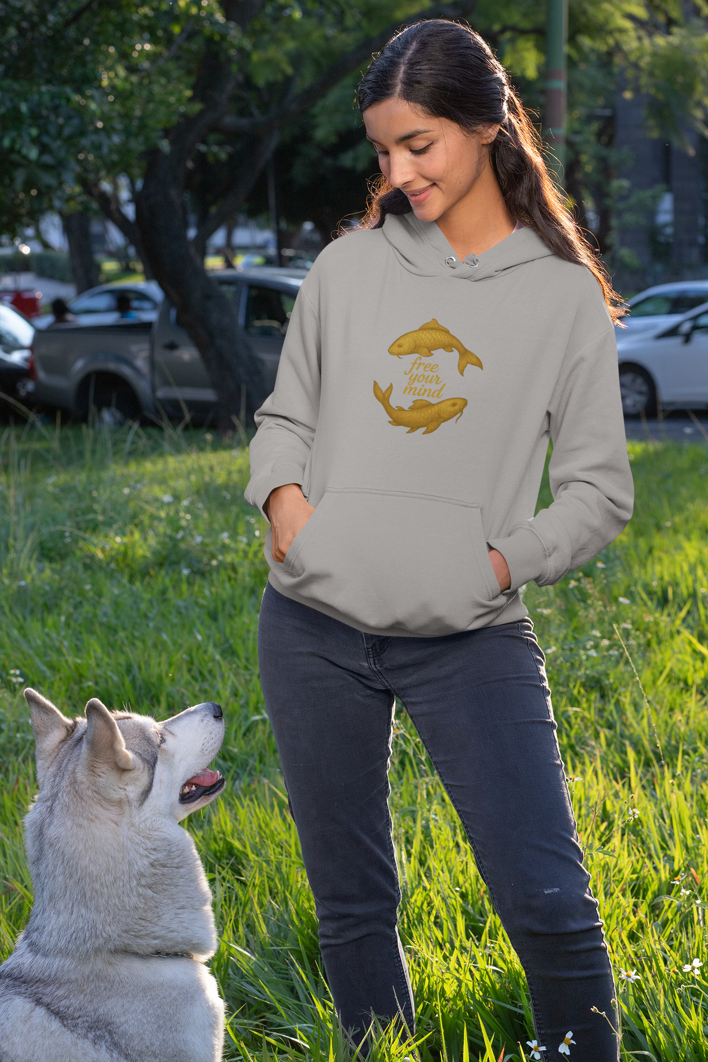 Der „Goldfisch“ Hoodie bringt dir ein Gefühl von Flow und Balance – und erinnert dich an das Wichtigste: free your mind. Die beiden goldenen Koi-Fische stehen für Glück, Ausdauer, Transformation und seelische Freiheit.