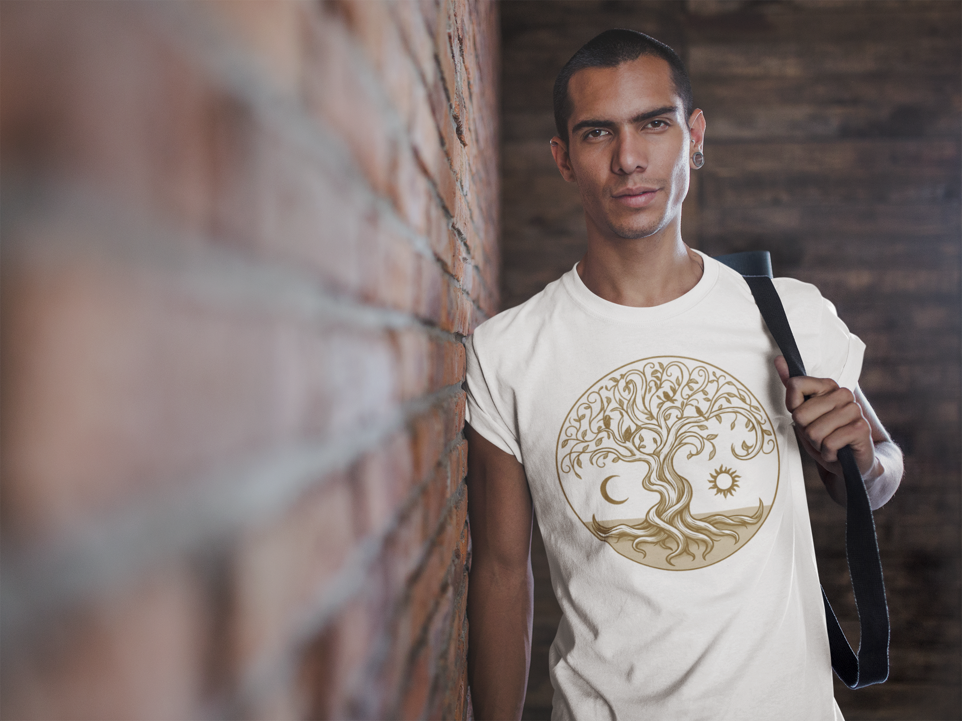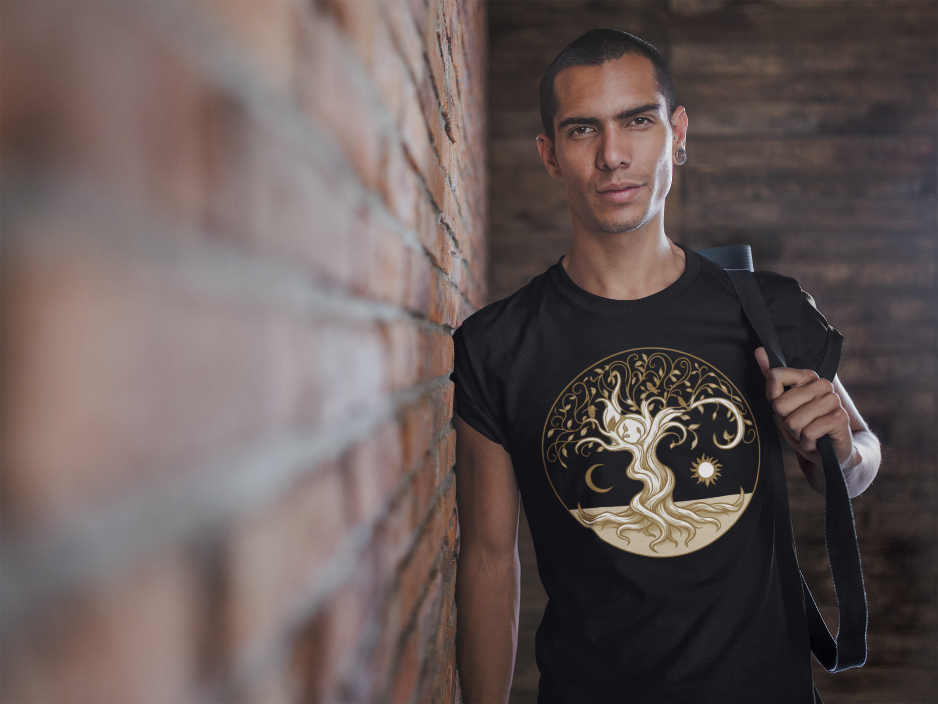 Dieses T-Shirt zeigt den Lebensbaum in einer eleganten gold-beigen Linienkunst, die Kraft, Stil und spirituelle Tiefe verbindet. Die zentrierte Komposition aus verwobenen Ästen, mystischem Mond und strahlender Sonne symbolisiert Balance, Wachstum und die Verbindung von Himmel und Erde.