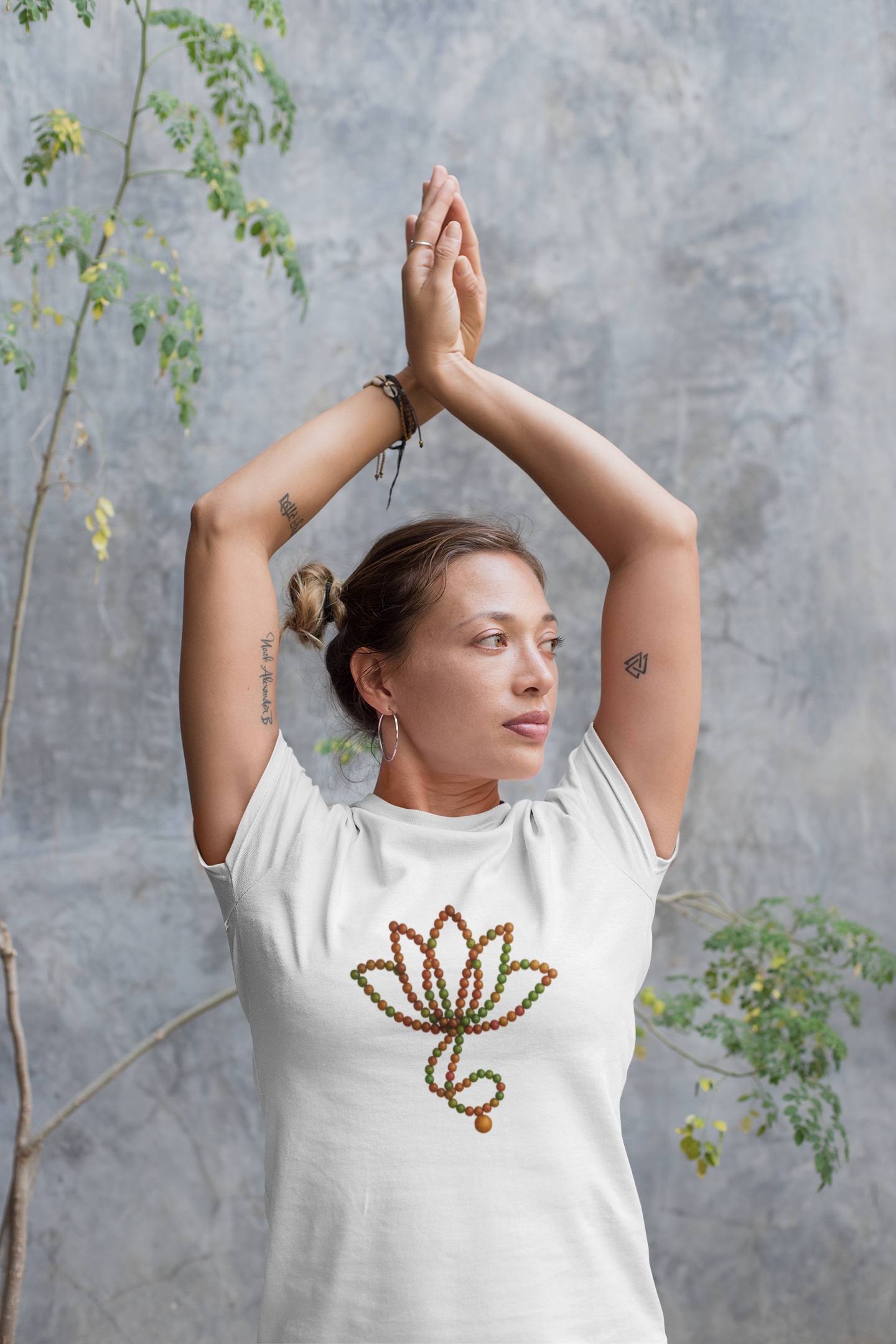 Dieses T-Shirt mit dem einzigartigen „Malakette“-Design verbindet spirituelle Symbolik mit modernem Minimalismus. Die kunstvoll angeordnete Mala-Perlenform erschafft eine elegante Lotus-Silhouette – ein Symbol für Klarheit, Bewusstsein und die Kraft des inneren Weges.