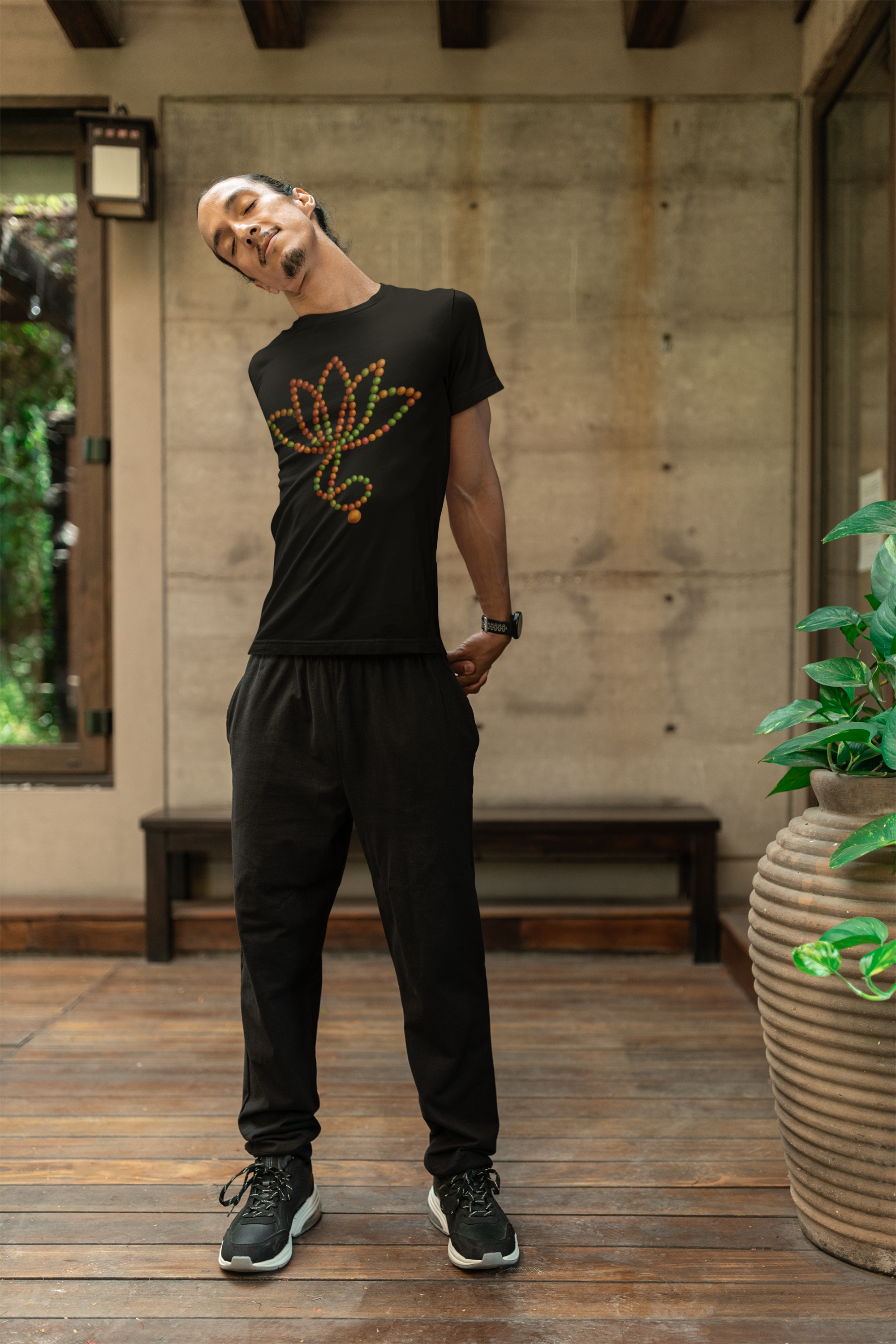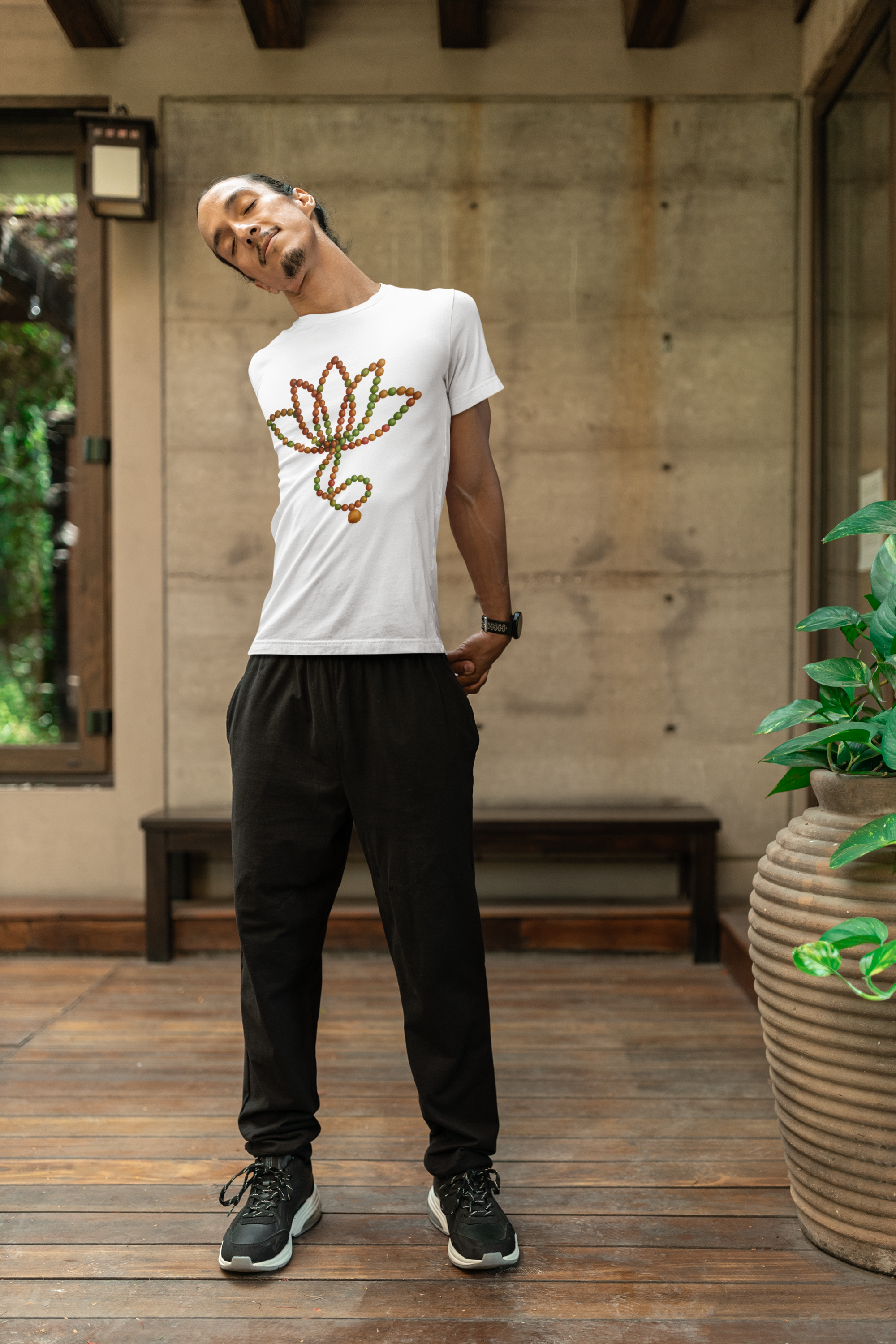 Dieses T-Shirt mit dem einzigartigen „Malakette“-Design verbindet spirituelle Symbolik mit modernem Minimalismus. Die kunstvoll angeordnete Mala-Perlenform erschafft eine elegante Lotus-Silhouette – ein Symbol für Klarheit, Bewusstsein und die Kraft des inneren Weges.