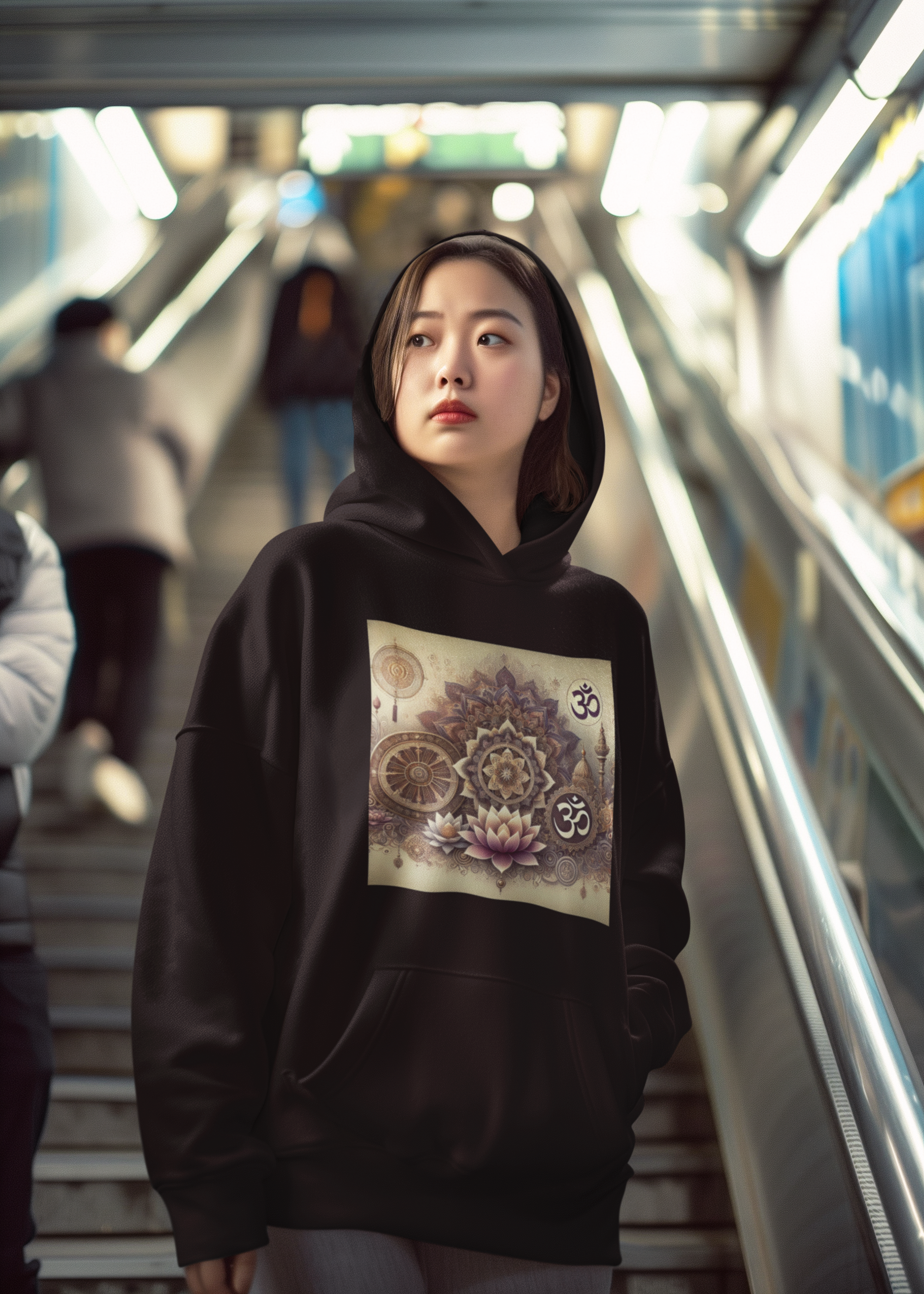 Das harmonisch gestaltete Om-Symbol im Zentrum, umgeben von Lotusblüten und feinen Ornamenten, steht für Schutz, Reinigung und Klarheit – und macht diesen Hoodie zu einem treuen Begleiter auf deiner inneren und äußeren Reise.