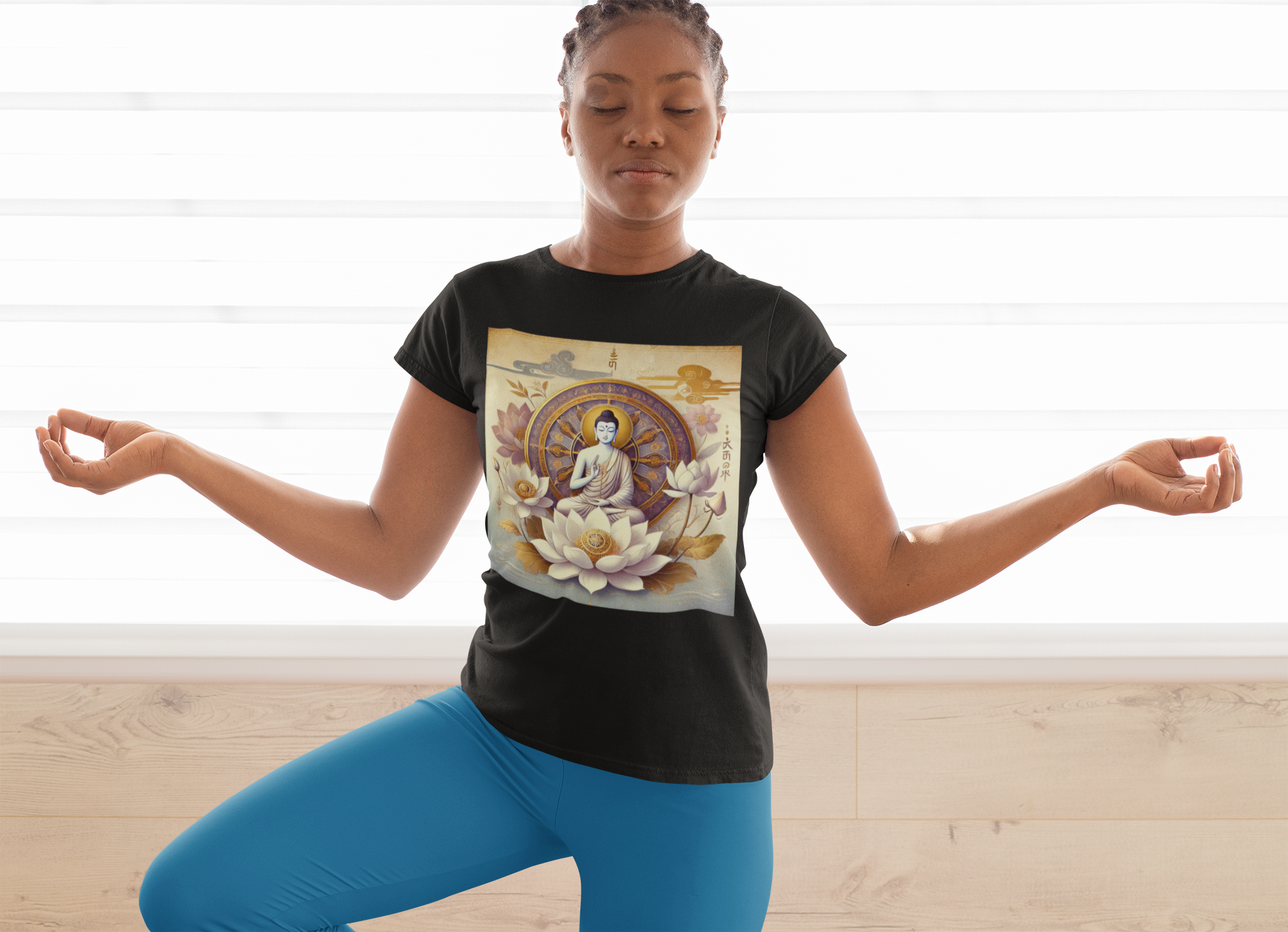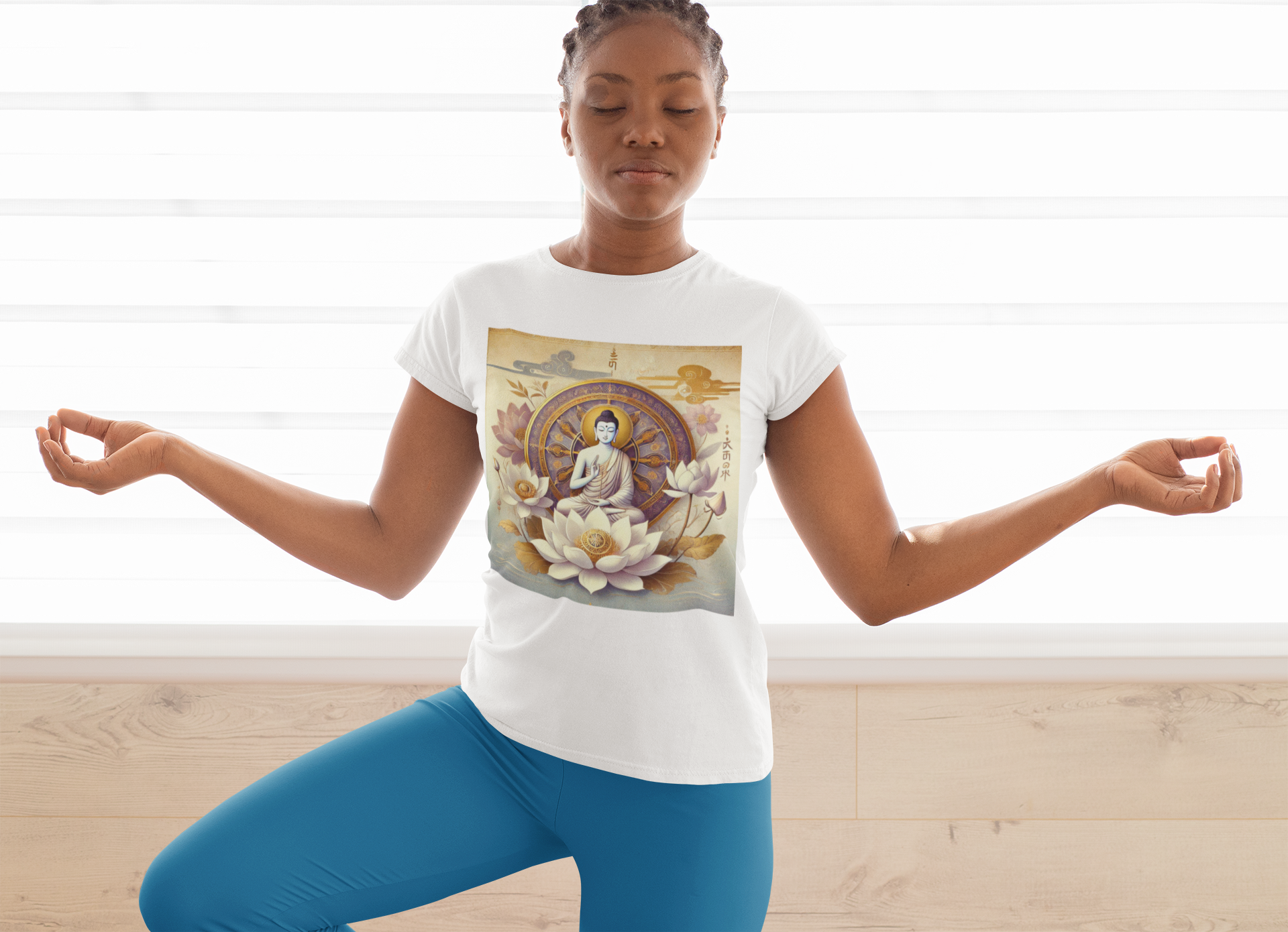 Dieses Design zeigt einen meditierenden Buddha, eingebettet in einen kraftvollen Lotus und das Dharma-Rad – ein Symbol für Erkenntnis, den Weg der inneren Balance und die Reise zur Erleuchtung.