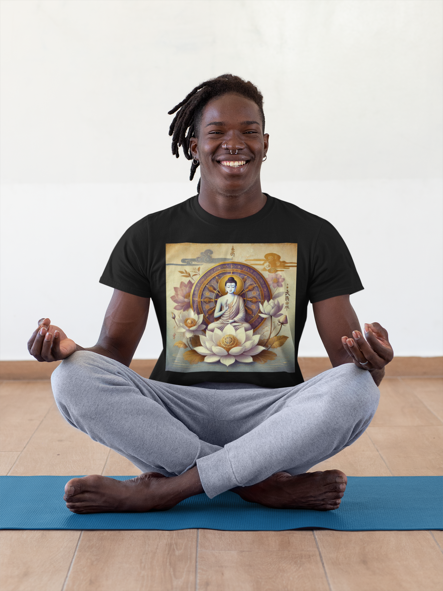 Dieses Design zeigt einen meditierenden Buddha, eingebettet in einen kraftvollen Lotus und das Dharma-Rad – ein Symbol für Erkenntnis, den Weg der inneren Balance und die Reise zur Erleuchtung.
