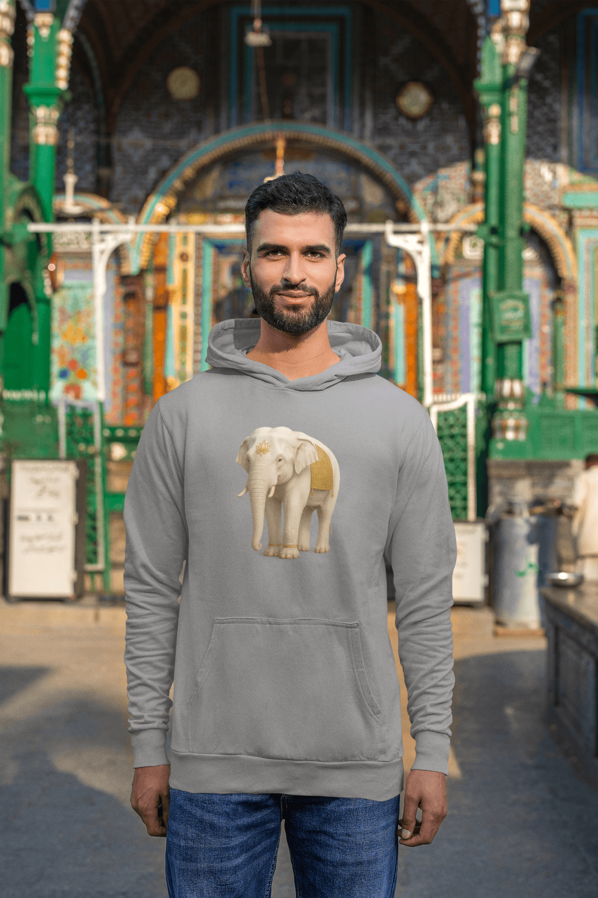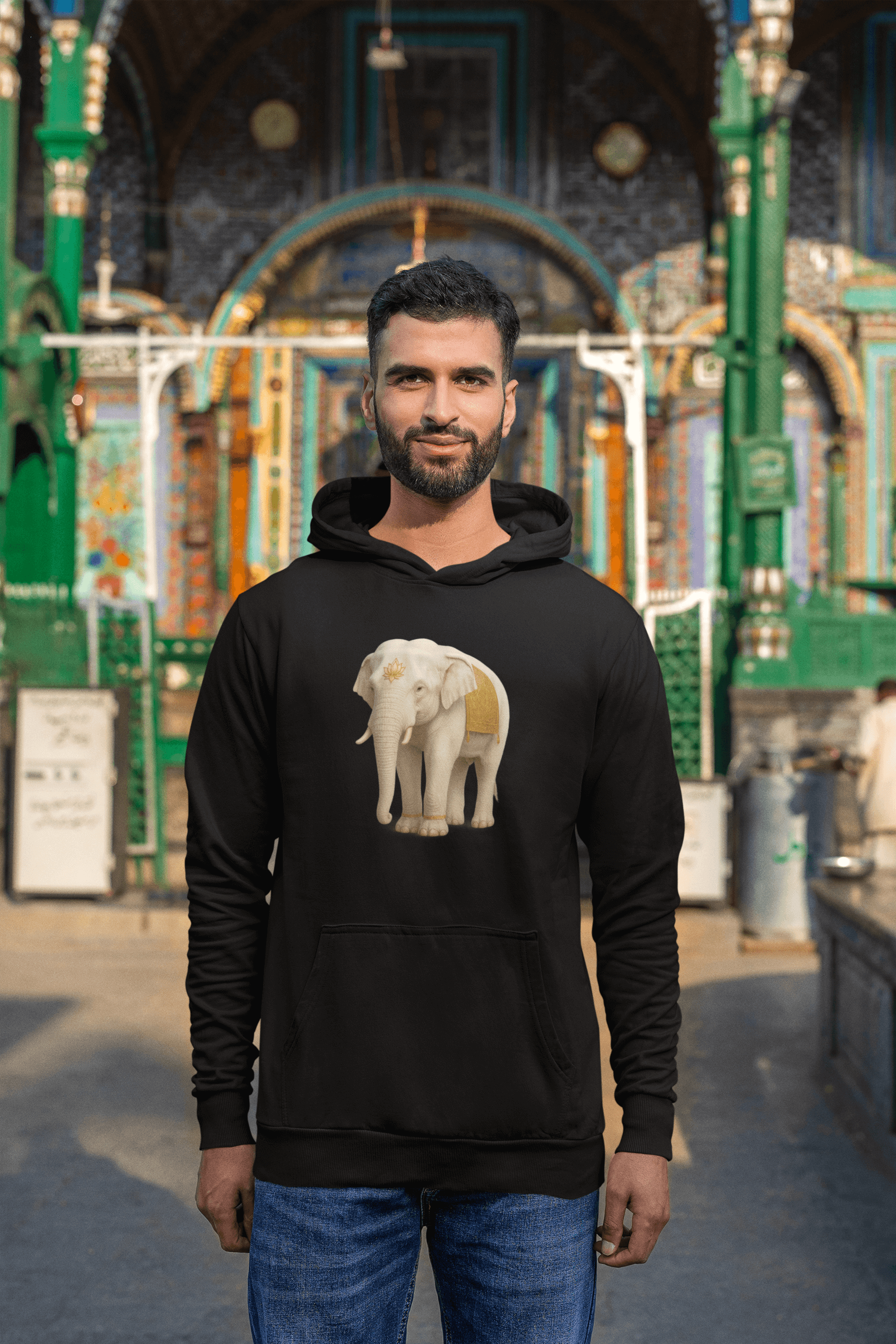 • Mann trägt den Weißer Elefant Herren Hoodie mit Elefanten-Design vor einer farbenfrohen Kulisse.